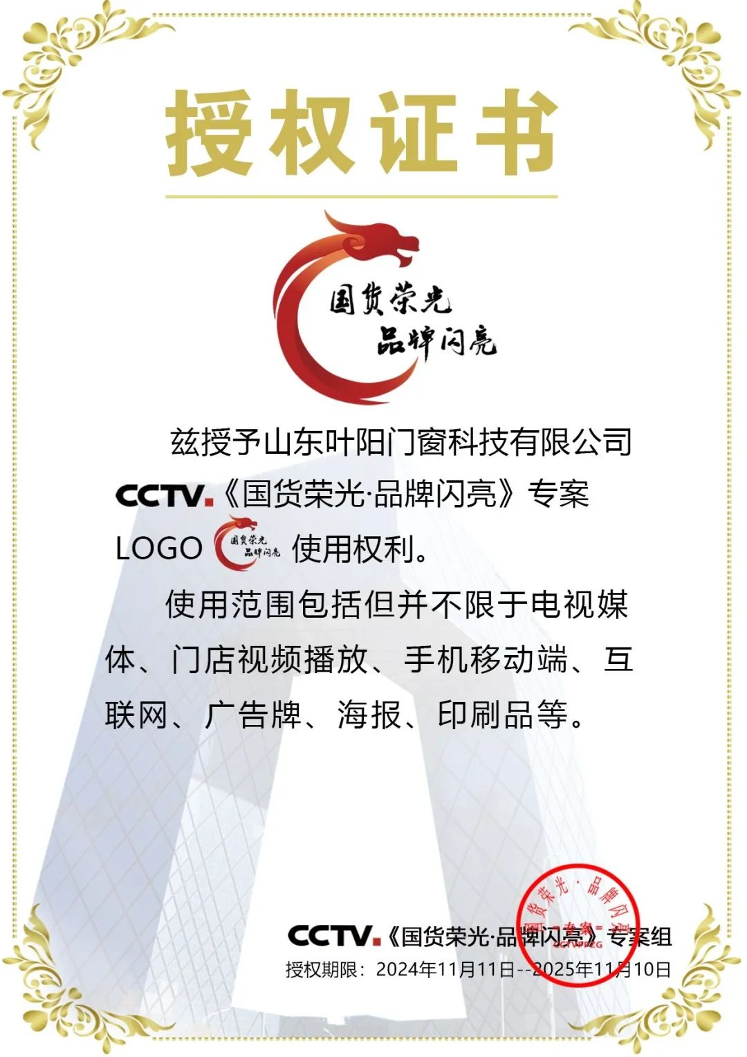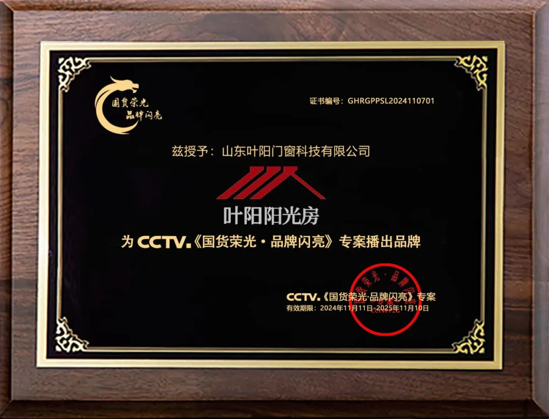 《国货荣光 品牌闪亮》专案整装升级,全新改版,旨在崛起国货品牌,成就国货之光!作为总台正式备案推荐的“国”字头IP,是继总台《强国工程》《大国品牌》后又重磅推出的国字头品牌传播项目。《国货荣光 品牌闪亮》专案以跨频、跨屏、强曝光、多维度的形式为国货品牌的崛起赋能、助力!叶阳凭借阳光房/系统窗其卓越的研发实力、精湛的生产工艺以及独特的文化理念,成功获得专案组的青睐与认可。这一荣誉不仅是对叶阳品牌实力的肯定,更是对中国民族品牌在国际舞台上展现风采的有力证明。