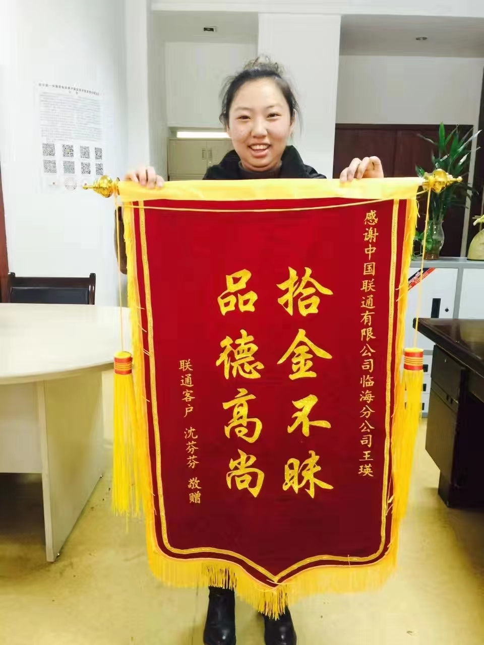 国庆期间,临海分公司巾山东路联通营业厅迎来一批又一批的用户,办手机的、受理宽带的...营业厅人头涌动;VIP受理台席前,客户经理王瑛办理好用户业务,忽然注意到柜台边地板角落里躺着一小堆红灿灿的现金和一台苹果手机,环顾四周,也没有一个用户来认领,王瑛心想“丢钱的用户该有多着急”,当下就拿起苹果手机拨通了最近一个通话号码,从电话里王瑛了解到对方是该机主的朋友,王瑛把用户财物丢失的情况说明,机主朋友表示立即帮忙联系。不一会儿,只见一对中年夫妻急匆匆地从营业厅大门外走了进来,当王瑛核对用户手机信息和现金金额无误,把钱和手机交到用户手上时,用户的感激之情溢于言表,连声说谢谢。事后他们手持锦旗送到临海分公司,亲手把锦旗交到VIP客户经理王瑛手里,赞扬联通公司培养出这么优秀的员工,并表示接下来会一直使用联通产品。