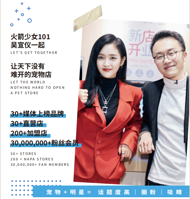 旗下“萌小它”宠物连锁品牌创办于2019年11月,同月入选热门综艺节目江苏卫视《我想开个店》,首店与火箭少女101吴宣仪联合创业,引爆全国宠物创业热情。