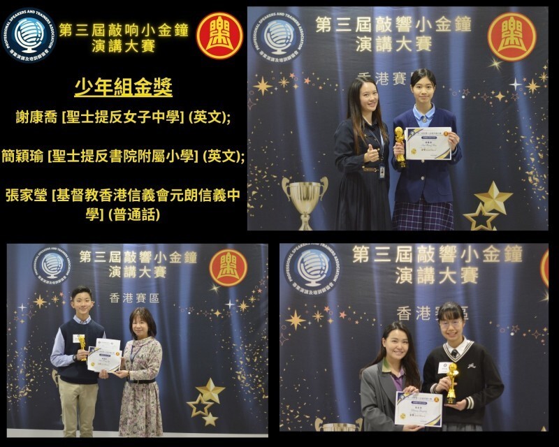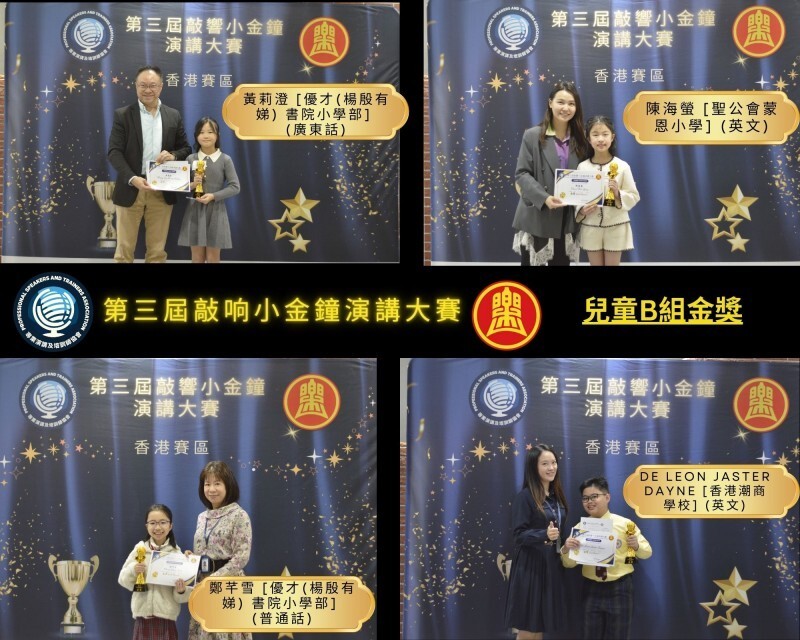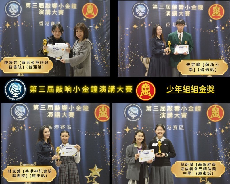 【2025年2月23日,中国香港】由香港专业演讲及培训师协会主办的「中国小金钟演讲比赛香港赛区决赛」於2025年2月22日至23日顺利举行。本次赛事吸引全香港多间中小学及教育机构的学生参与,逾百名选手在「儿童A组」、「儿童B组」及「少年组」三大组别中展开激烈角逐,最终决出各组别金、银、铜及优异奖项,展现香港青少年卓越的语言表达能力与舞台风采。