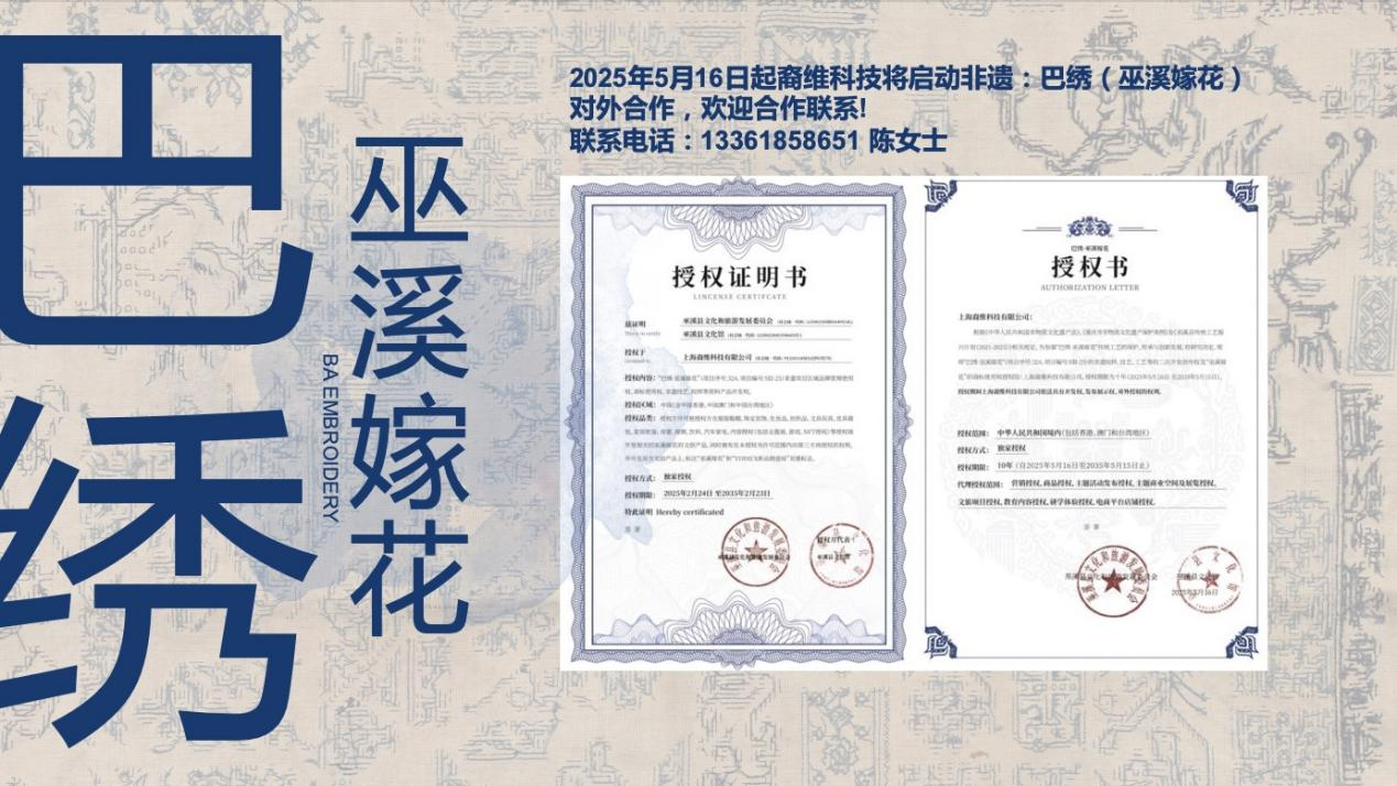 2025年5月16日,上海裔维科技有限公司与重庆市巫溪县文化和旅游发展委员会正式签署《巴绣(巫溪嫁花)国家级非遗区域公共品牌项目委托授权合同》,作为巴绣(巫溪嫁花)独家代理;本次双方的携手合作标志着巴绣正式开启品牌化、数字化、产业化发展的新征程。