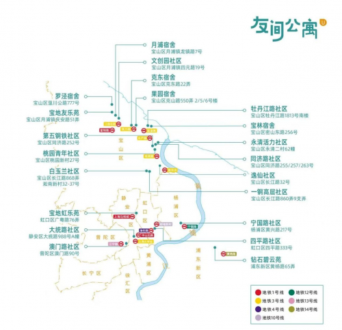 友间公寓依托中国宝武的央企背景,通过整合资源,对集团内交通便利的存量不动产资源进行改造、新建,打造“落脚—安居—发展” 全周期居住场景。目前,在上海自持运营27家门店,近9000间房,运营规模近40万方。主要分布在宝山区、杨浦区、虹口区、静安区、普陀区、浦东新区等。产品线以员工宿舍、白领公寓、高端服务式公寓为主。主力户型为一室户、两室一厅、三室一厅,为来沪青年提供从“一张床到一间房再到一套房”的全周期居住服务,形成“宿舍-公寓-家庭房”的居住升级闭环,自2016年成立以来,已为近5万人次青年提供坚实的安居保障。