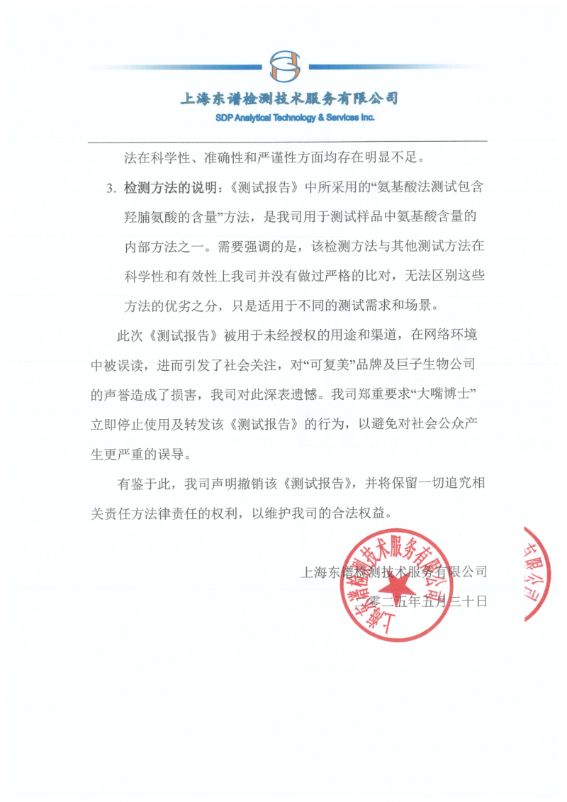5月30日,巨子生物已收到“大嘴博士”(郝宇)所引用的检测机构正式发布的声明,其中明确表示并未授权其引用测试报告,更不认同其对外传播行为,称其行为已对社会公众造成严重误导。该机构已要求其立即停止使用该报告,以免事态进一步扩大。