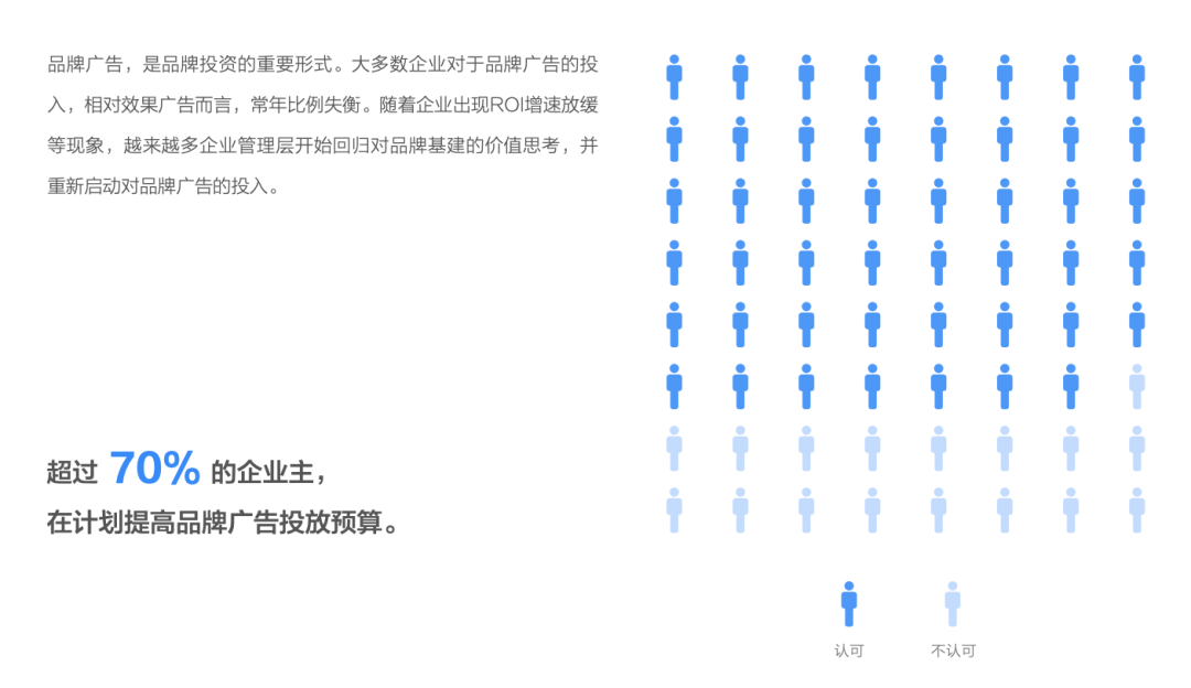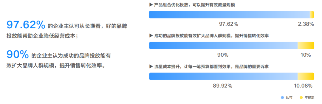 调研显示,实际上高达94%的企业主依然坚信品牌才是企业发展的护城河;超过70%的企业主在计划提高品牌广告的预算。