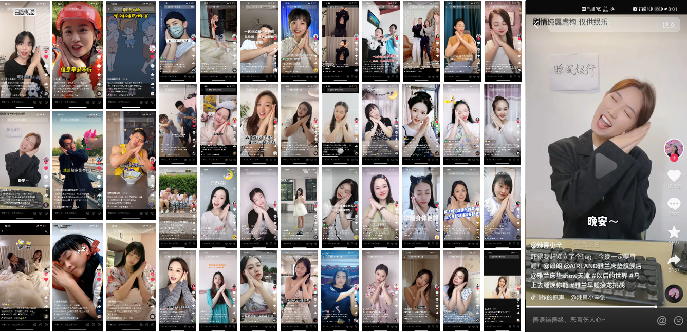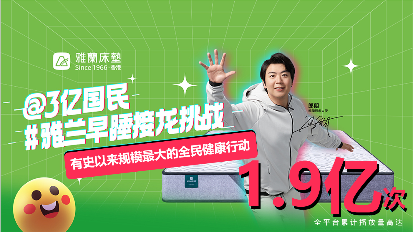 这几年,无论是主打“深睡概念”还是“健康定制”,好像都不太能挠到用户情绪了。头脑冷静下来的企业已经不再关注概念,而是开始琢磨用户情绪。比如从洞察这个时代的睡眠问题,特别是年轻人的睡眠情绪开辟新流量阵地。最近素有国民品牌老字号之称的香港雅兰床垫,在抖音发起“早睡接龙挑战”,号召广大国民培养健康早睡意识,并出资奖励参与早睡挑战的网友,引发1.9亿次话题点击,形成现象级传播,就是最好的例证。