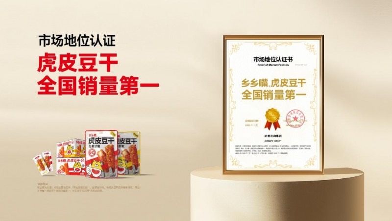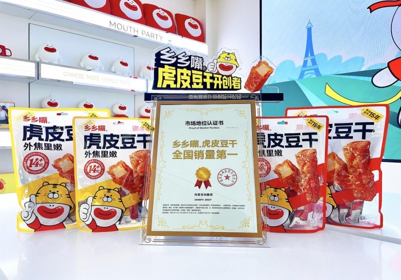 近日,经权威认证机构尚普咨询集团认证,乡乡嘴虎皮豆干位居全国销量第一。数据综合比较了全国范围内各渠道市场虎皮豆干销量情况,再次证明乡乡嘴在这一市场的龙头地位。