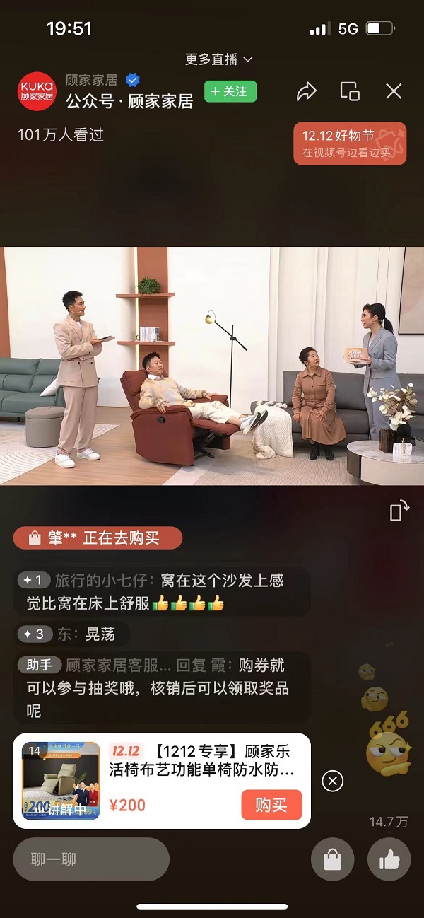 腾讯视频联合视频号为顾家家居打造的顾家好物节直播,采用“综艺式”的直播风格,观众犹如看综艺节目一般,在享受节目同时可以轻松“Get同款好物”,了解品牌理念,交互感极佳,相比既往快节奏、同质化的“叫卖式”直播带货有着极大创新。