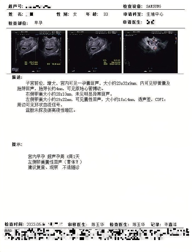 四、朱女士,34岁,外院试管婴儿治疗反复失败,参加联合门诊后建档进周,取卵一次移植两次后成功怀孕。B超显示三孕囊,后根据身体状况进行了减胎手术。