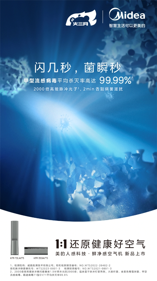 美的鲜净感空气机采用了高能脉冲杀菌技术,可以有效地破坏甲流病毒的蛋白质、DNA,使其失去复制能力,从而实现高效的杀菌效果,预防和控制各种传染病的传播。经权威实验验证,美的鲜净感空气机搭载的高能脉冲杀菌技术,可在2分钟内达到99.9%的除菌率,对空调内部进行有效消杀,让空调开启前更洁净健康。