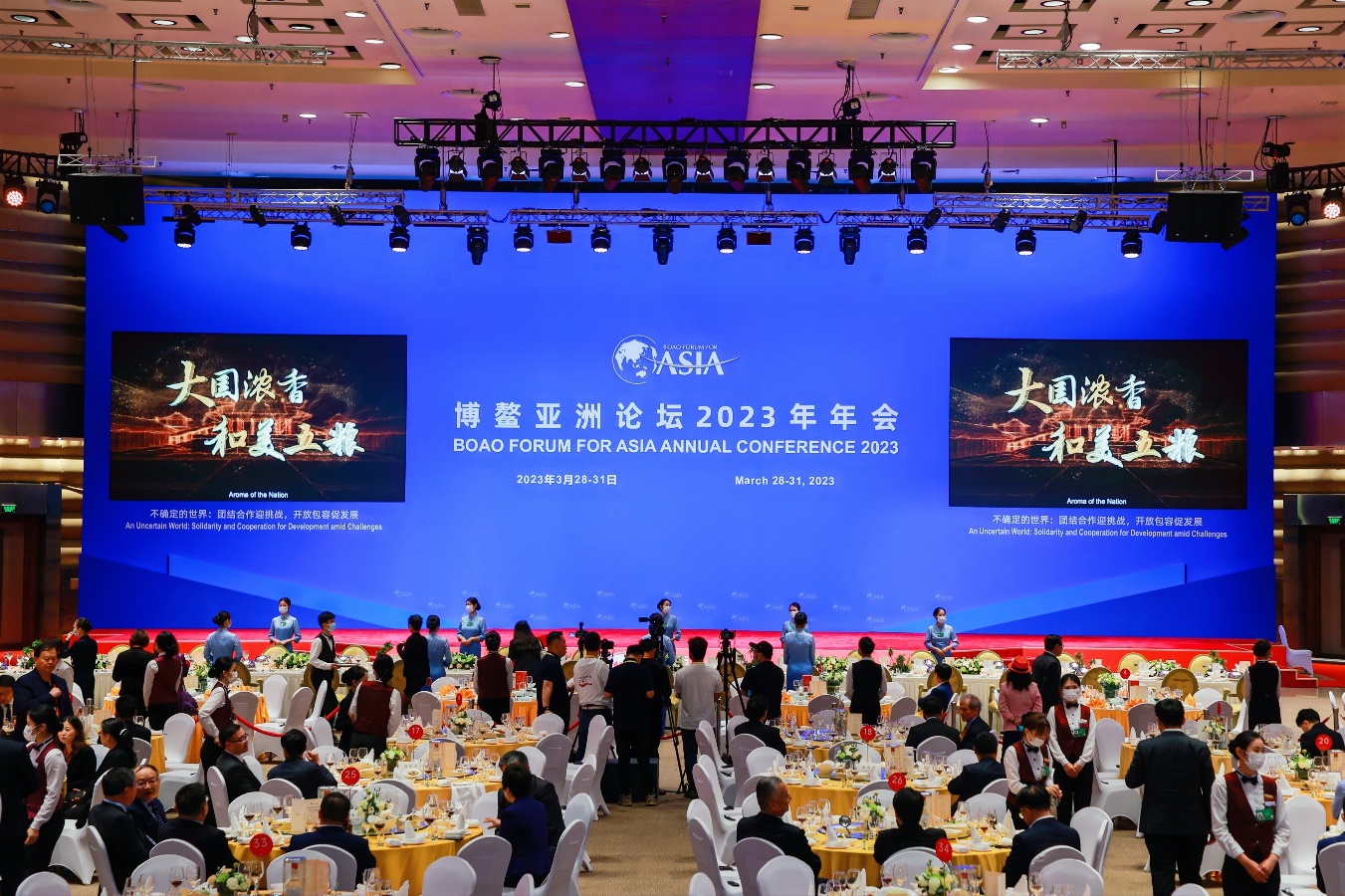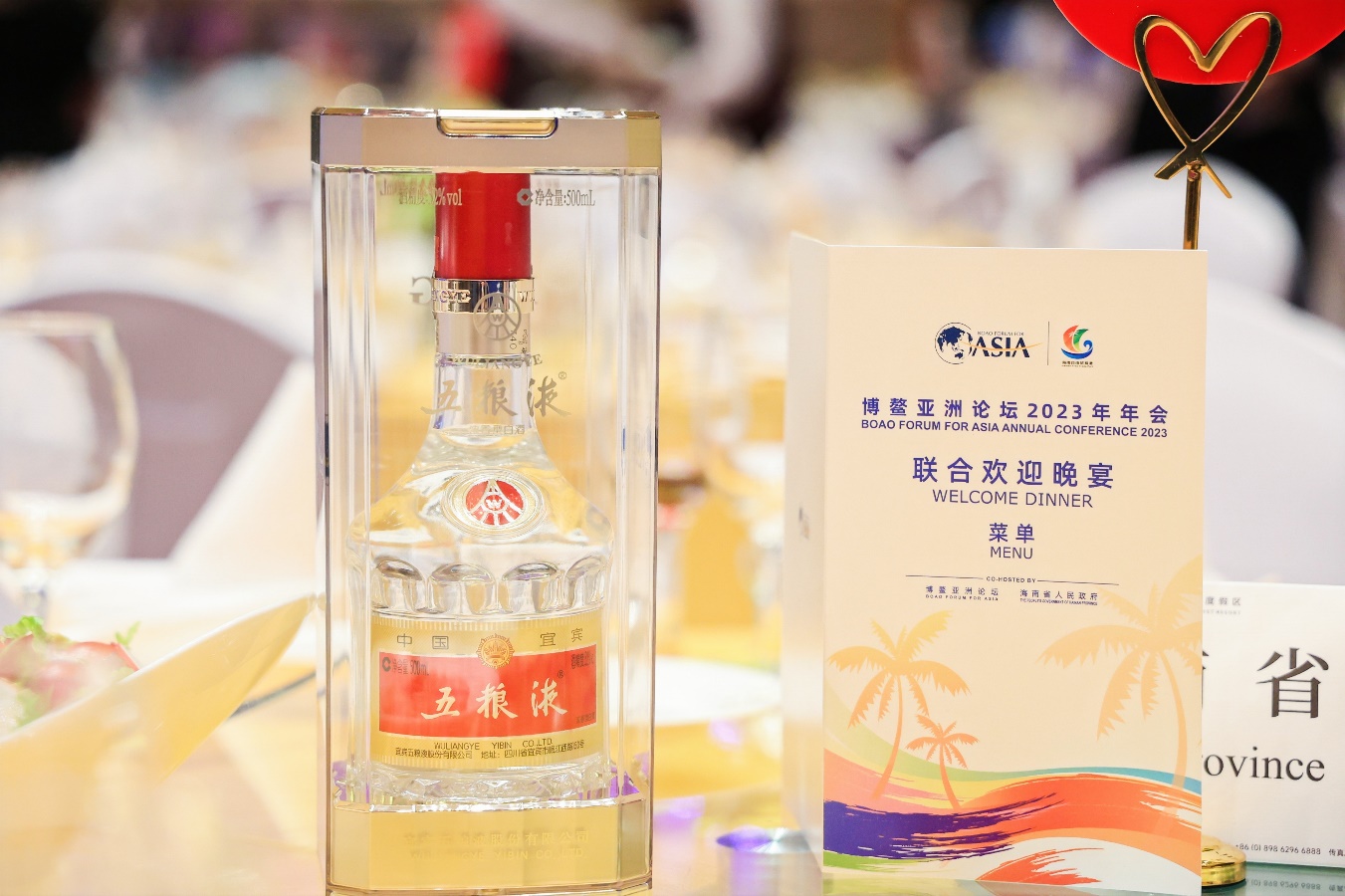 3月30日,博鳌亚洲论坛2023年年会开幕当晚,博鳌亚洲论坛与海南省联合举办的欢迎晚宴隆重举行。年会官方指定用酒五粮液香飘现场,向八方宾朋展示中国白酒的独特魅力,为促进中外交流互鉴、凝聚共识贡献醇香四溢的和美力量。