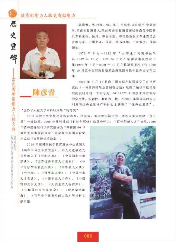 陈彦青,男,汉族,1953年1月出生,本科学历,中共党员,河南省临颍县人,现任河南省临颍县新城路南段中医鼻炎专科主任、医师、中医名医、中国特效医术专业委员会首席专家、中国艺圣、国家一级书画师、中医教授、国学领袖。