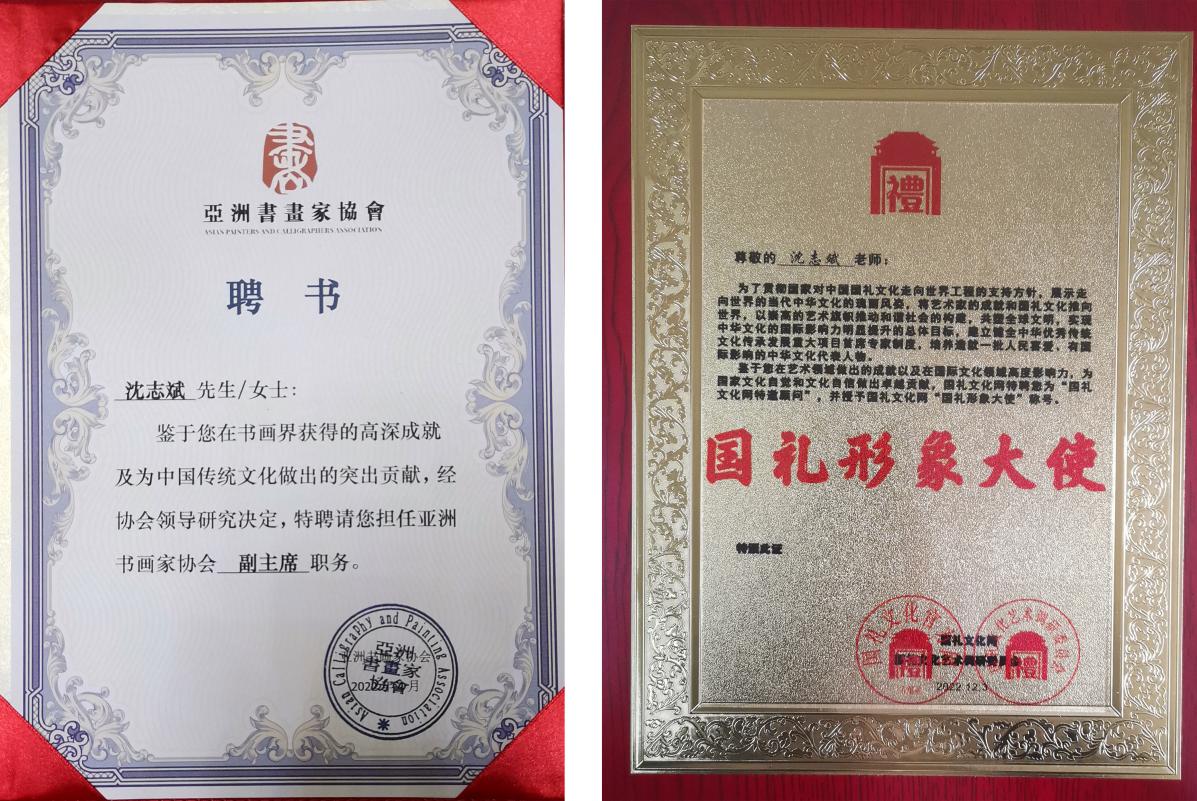 1981 年夏在庐山举办的中国工艺特艺博览会期间,更有幸陪同我国著名绘画大师、中央工艺美院院长张仃先生并陪同他在庐山写生,认真观摩大师的焦墨山水写生创作,聆听大师的美术讲座,从而对中国画的写生创作和中国画表现手法及技法有了更深刻的体会和感悟。1982 年曾安排接待“虹庐画派”传人上海文史馆王康乐及徐悲鸿学生周竹湘二位老先生。在庐山近-一个月时间里,与他们二老朝夕相处,一同外出写生作画。在绘画过程中,耳濡目染深得他们]的教诲与指点,从而画艺日渐长进,王康乐先生观后题词赠画日:“志斌同志近研虹庐法颇得其妙写此请正”。2009 年 6 月由庐山文化局九江市美协主办沈志斌个人书画展在九江市美术馆举行,受到美术界好评。“2019 年度国际中国艺坛领军人物”。2020 年 5 月中国报道网授予“当代最具收藏潜力艺术家”。2020 年 8 月入选中国书画联谊会新文艺群体书画家工作委员会当代艺坛翘楚书画家专题报道。2020 国际中国公益事业大典授予在“辉煌七十年,抒写新时代——文化中国 中国优秀传统文化高峰论坛暨迎新联谊会”活动中被授予奋斗改变生活·.新时代文化经济和谐共建优秀个人以及年度文化精英人物。2021 年 9 月参加庆祝建党 100 周年“聚焦经典 盛世丹青”当代艺术名家邀请展。在日后的绘画创作生涯中,始终为之潜心钻研、心默手写、锲而不舍,已逐渐形成自己独特的创作风格和表现形式,赢得了美术界同仁的认可和好评。