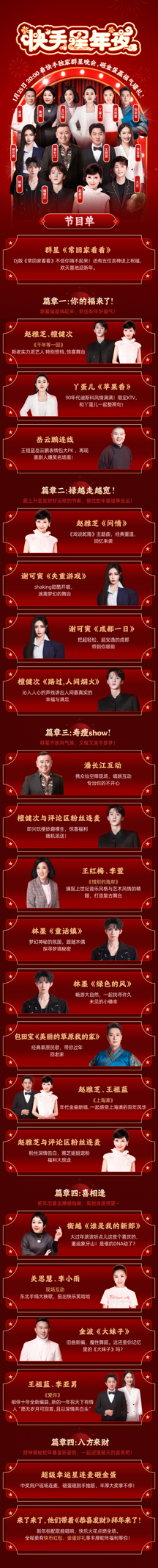 快手星年夜的晚会内容被精心设计为五大篇章,每一章节分别由福禄寿、喜神和财神五位神仙角色开启,爆款节目值得期待!檀健次和赵雅芝将携手献上经典歌曲《千年等一回》,用歌声带你穿越时空,感受那份经典的永恒之美;潘长江将以幽默诙谐的方式进行唱跳表演,展现东北老铁的独有幽默;王祖蓝和赵雅芝的经典对唱《上海滩》,一波回忆杀让人回味无穷;王祖蓝与李亚男这对夫妇在结婚十周年之际,以特别方式合唱《爱你》,分享他们的甜蜜时刻,传递爱与温馨……每个篇章不仅有精彩的表演,还穿插了丰富的福利互动环节,让观众们能深度参与到这场盛大的狂欢中。