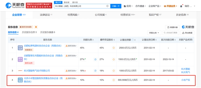 近日, 科大智能(合肥)科技有限公司发生工商变更,新增股东北京小米智造股权投资基金合伙企业(有限合伙)。据悉,此公司是小米投资事业部投资主体。