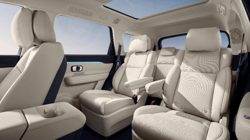 空间是eπ008的绝对强项。5米车长与3米轴距的黄金比例,让第三排不再是“小板凳”:二排独立座椅间距直追豪华MPV,三排乘客也能获得体面的腿部空间。更难得的是,即便满员6人,后备厢依然能轻松塞下3个28寸大箱子,周末露营的折叠桌椅、婴儿车通通不在话下。