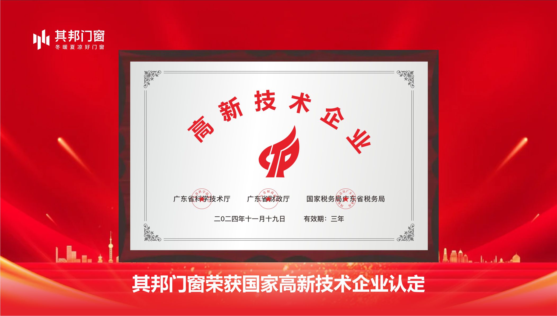 创立于2013年的其邦门窗,已从南海之滨的地方企业成长为全国性行业标杆。企业先后荣获“中国铝合金门窗行业十强企业”、“中国泛家居发展中企业500强”、“中国铝门窗十大品牌”、“广东省创新型中小企业”、“高新技术企业”、“佛山优品”、ISO三体系认证等权威荣誉。