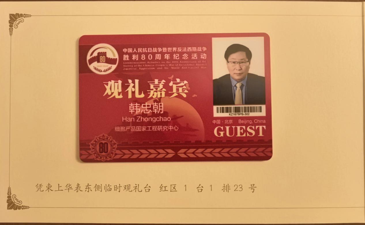 2025年9月3日,北京汉氏联合生物技术股份有限公司董事长、法国国家技术科学院院士、法国国家医学科学院外籍通讯院士、细胞产品国家工程研究中心主任韩忠朝教授,作为我国干细胞行业的杰出代表,荣幸受邀参加中国人民抗日战争暨世界反法西斯战争胜利 80 周年阅兵仪式。
