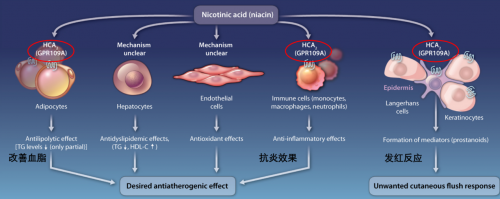 即使烟酸是目前最有期望地能够延长人类寿命的维生素,但它也不是完美的。服用较大剂量的烟酸会产生一种潮红反应,会被很多人误解为烟酸的副作用。但其实这是烟酸激活人体内一种叫做GPR109A的抗炎症受体的反应。人体在受到损伤或者被病菌入侵的时候身体内炎症水平会提高,同时也会增加GPR109A受体的表达。当摄入烟酸以后这些GPR109A受体会被激活,在产生红热反应的同时进行修复并且降低炎症因子的水平。
