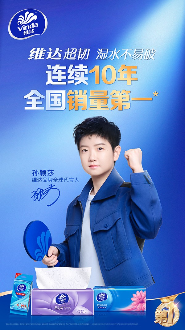 维达的成绩不止于绿色生产与创新成果,更体现在品牌建设与市场推广方面。8月举行的天猫金妆奖评选中,荣获“年度TOP品牌奖”、“年度纸品奖”和“家清年度卓越贡献奖”三项大奖。9月,维达在京东超市周年庆典获得“巅峰荣耀品牌奖”,体现了业界和消费者对其品牌力与产品力的高度认可。今年,维达还正式官宣中国乒乓球运动员孙颖莎为品牌全球代言人,借助其 “韧性” 运动精神传递品牌理念。除此以外,品牌更与国民动画IP哪吒官宣联名,以“当韧不让”的精神共鸣为纽带,推出联名款纸巾产品,进一步拓宽了"韧性"精神的传播场域,增强品牌与年轻消费群体的情感连接。