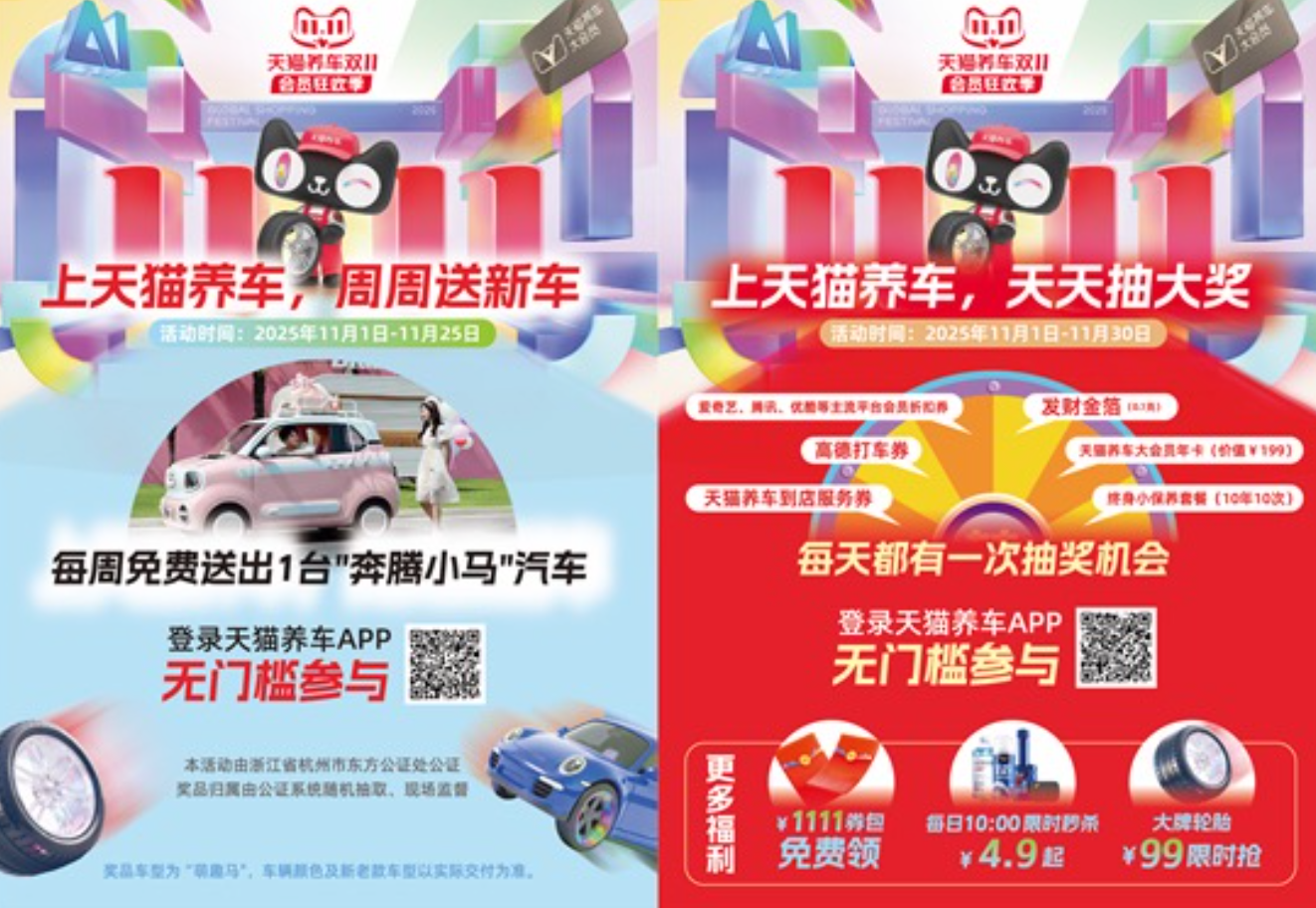 2025年双11期间,天猫养车通过抽奖方式每周免费送出一台汽车回馈用户