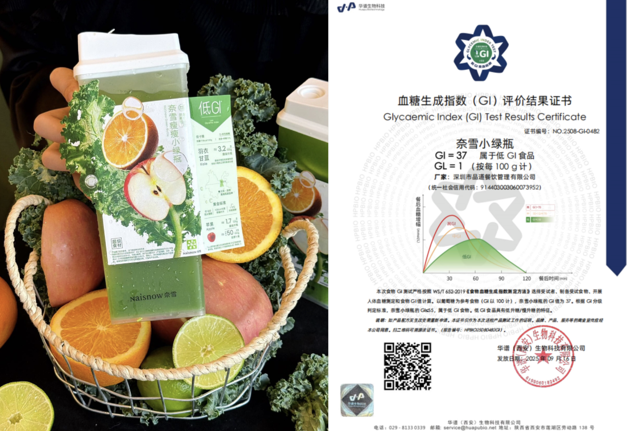 12月9日,奈雪的茶旗下明星单品“瘦瘦小绿瓶”蔬果茶获全球咨询机构CIC灼识权威认证,被正式授予“行业首款获低GI证书的蔬果茶”市场地位确认。此前,该产品已通过专业检测,GI 值低至 37(远低于≤55 的低 GI 标准),双重权威背书进一步夯实其健康茶饮标杆地位。
