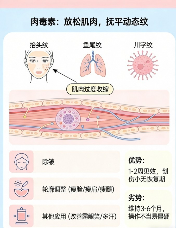 缺点:效果暂时,维持约3-6个月;操作不当可能导致面部表情僵硬、下垂或“假面感”。