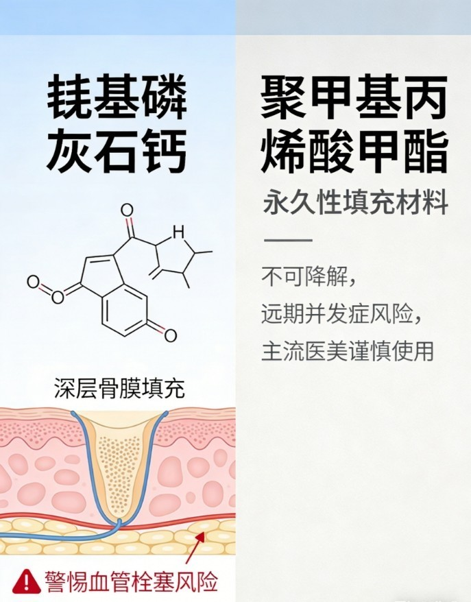 聚甲基丙烯酸甲酯:一种永久性填充材料,虽然维持时间长,但因不可降解且存在远期并发症风险,目前在主流医美应用中已非常谨慎,多用于特定医疗修复。