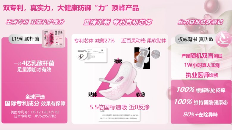 针对上述微生态失衡的底层痛点,高洁丝推出了蔓越莓益生力系列。这是一款标志着卫生巾从“物理介质”向“微生态调理”跨越的里程碑式产品。
