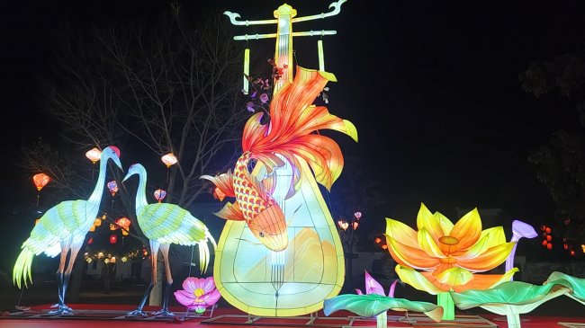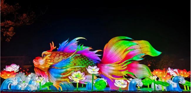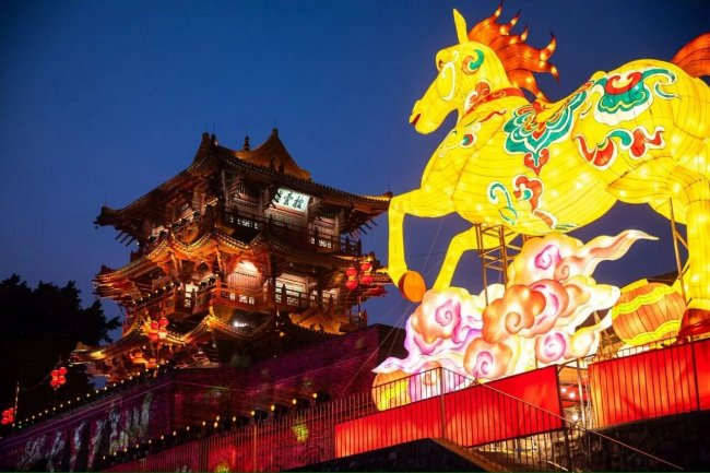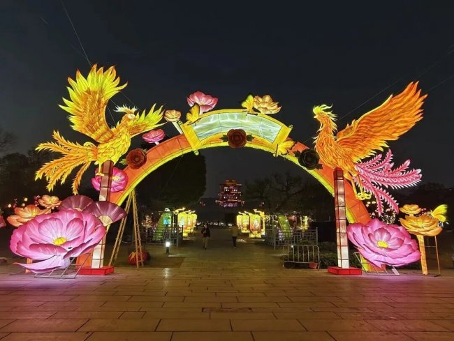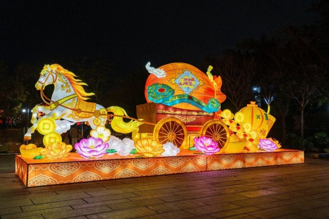 花灯造景,一步一画,是本次嘉年华的另一大亮点。府署遗址公园内,数十组精心设计的花灯错落布局,将传统工艺与现代设计、生肖元素与本土特色完美融合,让整个园区化身梦幻光影世界。丙午马年主题的 “逐梦山河” 花灯昂首扬蹄、气势如虹,尽显勇往直前的新春气象;“瑞鹤呈祥”花灯优雅伫立,荷花花灯亭亭绽放,以裹蒸微元素的花灯以金黄暖光勾勒出端州的市井烟火;丽谯楼上,“灵狮献宝”花灯憨态可掬,“霓裳迎宾”花灯于牡丹拱门上展翅迎客,“年年有余”“富贵吉祥” 的美好寓意藏于光影之间。这些花灯沿公园核心区域铺展,移步换景间,让市民游客在灯海中沉浸式感受千年府城的独特魅力。