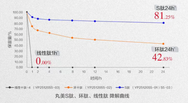 • 长效续航,稳定在线:得益于结构的升级,S肽的半衰期达到了天级。24小时后,它的保留量依然高达81.25%,稳定性是传统线性肽的24倍,实现了超长待机的呵护。