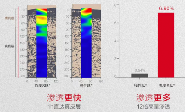 • 开启深层渗透革命:优秀的成分需要精准的触达机制。依托刚性结构的支撑,S肽优化了穿透表皮屏障的效率。实验数据显示,其渗透量达到了线性肽的12倍,能够在1小时直达真皮层,让核心成分真正参与到肌肤的深层修护中。