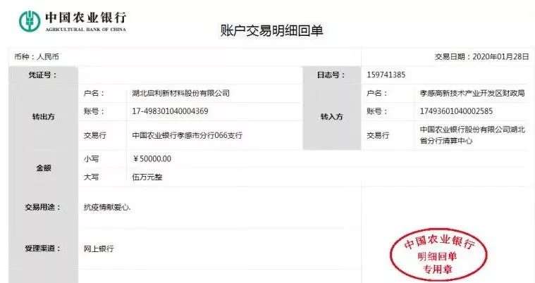《品牌中国》栏目了解到,上海龙锦东深投资管理有限公司一期投资基金投资的企业——湖北启利新材料股份有限公司,主动承担抗击疫情的社会责任,向孝感高新区人民政府捐款50000元,为抗击疫情贡献一份“绵薄之力”。同时,启利新材全体干部职工、合作伙伴积极响应党的号召,开展了“我为抗疫献爱心”募捐活动,自发捐款10800元,汇划到孝感慈善总会,为战“疫”加油鼓劲。