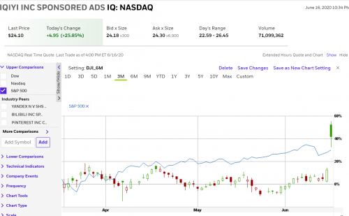尽管百度、爱奇艺和腾讯均表示对此不予置评。但股票市场还是迅速做出了反应。爱奇艺6月16日在美股盘前暴涨40%,截至收盘,爱奇艺涨25.85%。百度、腾讯的股票皆有不同程度的涨幅。