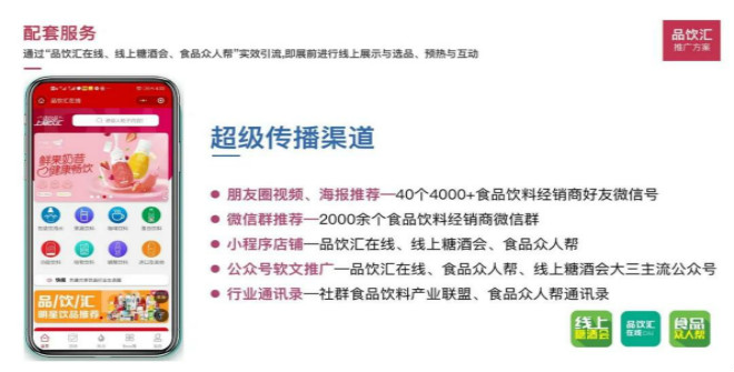 通过“品饮汇在线、线上糖酒会、食品众人帮、食品招商网、糖酒网、食品代理网、糖烟酒周刊、销售与市场等媒体平台”实效引流,即展前进行线上展示与选品、预热与互动!使线下观展更精准,更高效,更智能!