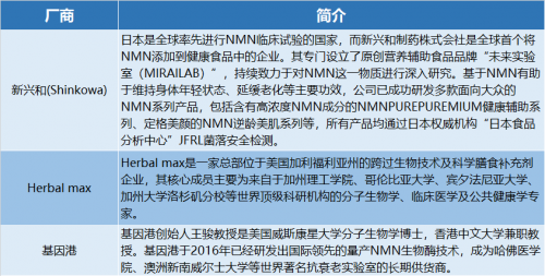 根据中信证券,目前NMN市场刚刚起步,主要由日本、美国、中国香港的三家企业主导,主要情况如下表: