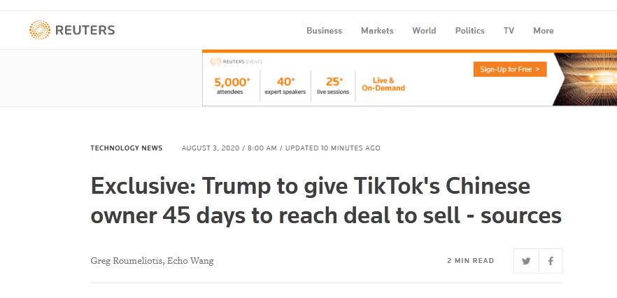 中新经纬客户端8月3日电 据路透社消息,两位知情人士8月2日表示,美国总统唐纳德·特朗普已经同意给中国字节跳动45天的时间来协商向微软出售热门短视频应用TikTok的事宜。