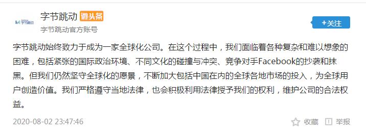 此外,8月2日23时47分,字节跳动发文称,字节跳动始终致力于成为一家全球化公司。在这个过程中,面临着各种复杂和难以想象的困难,包括紧张的国际政治环境、不同文化的碰撞与冲突、竞争对手Facebook的抄袭和抹黑。