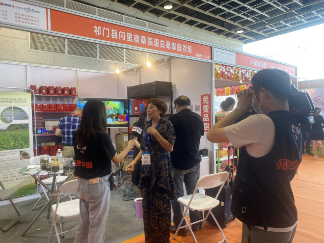 《品牌中国》栏目组采访黄山桑业农业科技发展有限公司法人陈翠英。陈女士向我们推荐公司的蛋白桑叶茶,该茶主要针对“三高”人群,将桑叶做成食品,让“三高”人群喝着桑叶茶,吃着桑叶的点心,让身体得到不错的保健效果。同时也想通过这次展会招代理,把品牌推向市场,让更多的老百姓喝到健康的茶。