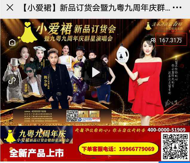 2020年9月9日,小爱裙品牌订货会暨九粤九周年庆群星演唱会,在南宁荔园饭店拉开帷幕,整个活动共分为两大部分,既是小爱裙品牌洗衣露隆重上市的新品订货会,也是九粤九公司的两周年庆典群星演唱会,整场活动盛况空前,并有《品牌中国》栏目组全程跟踪拍摄,30多家网络媒体进行同步直播,在现场三百多位行业大咖,以及场外观看直播的160多万观众的共同见证下,小爱裙洗衣露品牌一夜爆红,成为行内及行外人士茶余饭后谈论的焦点。这一条小爱裙到底有何魅力,让我们通过这场盛会来一探究竟。