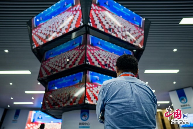 11月4日,第三届中国国际进口博览会开幕式在上海举行,中外媒体在新闻中心内观看开幕式。中国网记者 郑亮摄