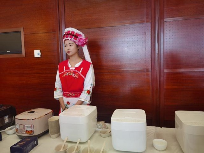 (参加发布会的嘉宾现场品尝“洱海留香”臻品软香米)