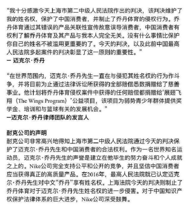 30日,迈克尔·乔丹发表声明表示,该判决维护了自己的姓名权,并制止了乔丹体育的侵权行为:“中国消费者有权了解乔丹体育及其产品与我本人完全无关。没有什么事情比保护你自己的姓名不被滥用更重要的了。”据迈克尔·乔丹团队介绍,案件的侵权的任何赔偿都将将捐赠给“展翅飞翔”公益项目。