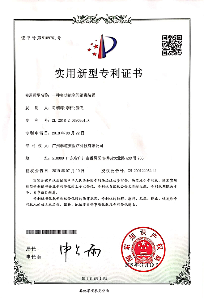专利产品标号:一种多功能空间消毒装置ZL 2018 2 0390651.X