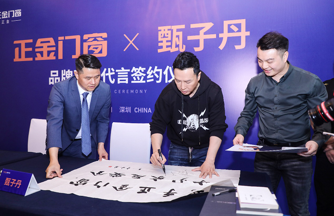 甄子丹先生于当天下午来到了品牌代言签约现场,首先体验了正金门窗最新推出的“功夫系列·寸劲平开窗”,对产品高度认可和评价。并向正金门窗发出诚挚的祝福。随后,佛山市德斯莱斯家居科技有限公司董事长黄少鹏与甄子丹先生签署战略合作协议,甄子丹先生正式成为正金门窗品牌战略合作形象大使。签约仪式环节完毕后,正金门窗提供数幅书法作品并邀请甄子丹先生签名,其后,以黄少鹏董事长为首,各位正金门窗领导班子纷纷与甄子丹先生合影,共同铭记属于正金门窗的历史性时刻。