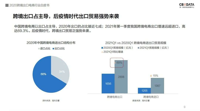 中国跨境电商以出口占主导,2020年出口的占比接近七成;2021年第一季度我国跨境电商出口增速远超进口,高达69.3%。后疫情时代,跨境出口贸易正强势来袭。