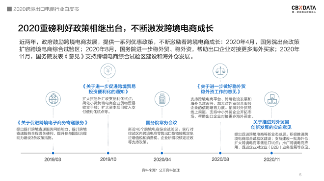 增长的背后离不开国家政策的鼎力支持。近两年,政府提供了一系列优惠政策鼓励跨境电商发展,如2020年国务院出台政策扩容跨境电商综合试验区,并发表意见帮助出口企业对接更多海外买家,都为跨境电商的成长提供了强劲的支撑力。