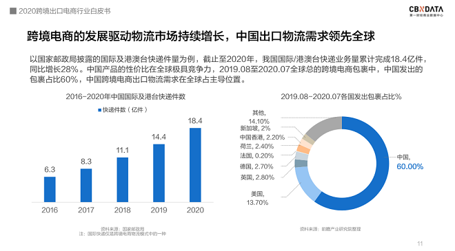 双十一屡屡刷新中国物流的“神话”,在跨境电商的发展上,中国物流同样领先全球。CBNData《报告》显示,2019年8月至2020年7月全球跨境电商包裹中,中国发出的包裹占比60%,中国跨境电商出口物流需求在全球占主导位置。