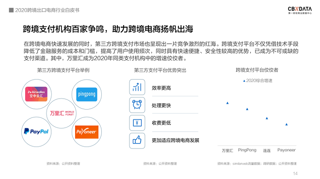 作为服务链路的另一关键环,第三方跨境支付市场也在蓬勃发展。万里汇(WorldFirst)、pingpong、PayPal、空中云汇等跨境支付机构百家争鸣,共同助推跨境电商乘风破浪。