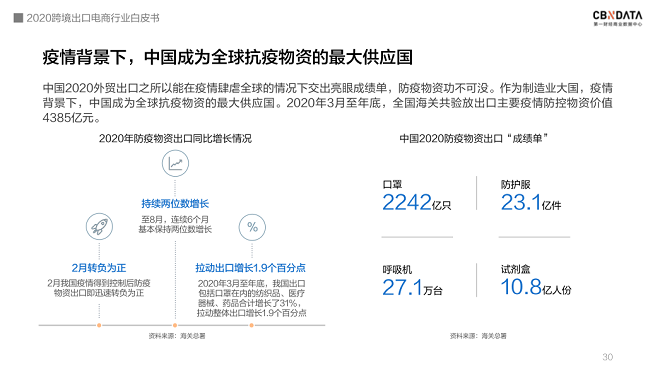 疫情致使全球贸易减少约五分之一,尽管如此,中国仍然是少数保持正增长的经济体之一。外贸出口交出了亮眼的成绩单,其中防疫物资功不可没:2020年3月至年底,全国海关共验放出口主要疫情防控物资价值4385亿元。