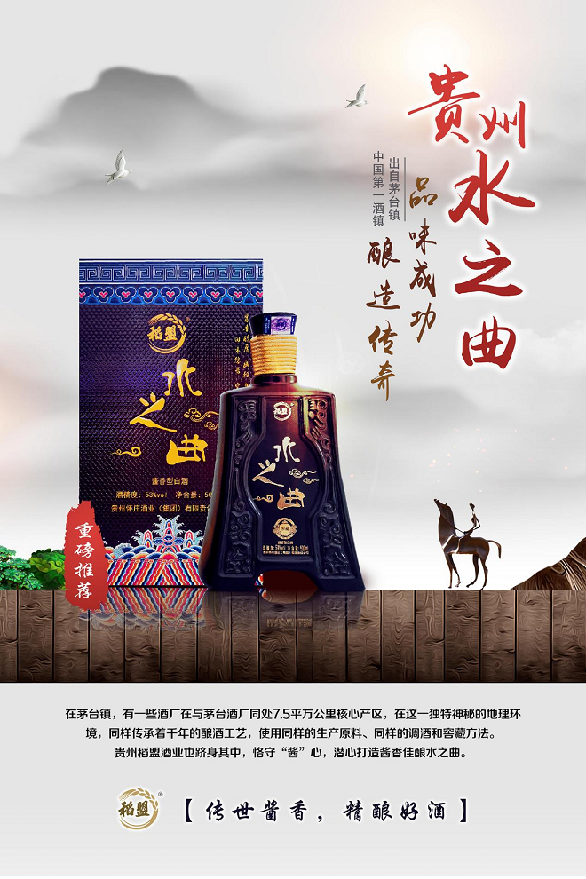 坐落于驰名中外的中国第一酒镇酱香型白酒原产地茅台镇7.5平方公里保护区内。主要生产销售“稻盟牌水之曲”系列酱香型白酒,产品畅销全国各地。其“稻盟”注册商标于2018年获得由国家工商行政管理总局商标局颁发第33类注册商标证书。主导产品“贵州水之曲”酒以茅台镇本地优质红缨子糯高粱,小麦,赤水河水为原料,利用得天独厚的自然环境,恪守茅台镇酱香型白酒传统酿酒工艺,九次蒸馏,八次发酵,七次取酒,历经春、夏、秋、冬一年时间精心酿制而成,从生产储存到出厂历经5年以上。具有酱香突出,优雅细腻,酒体醇厚,回味悠长,空杯留香持久的特点。